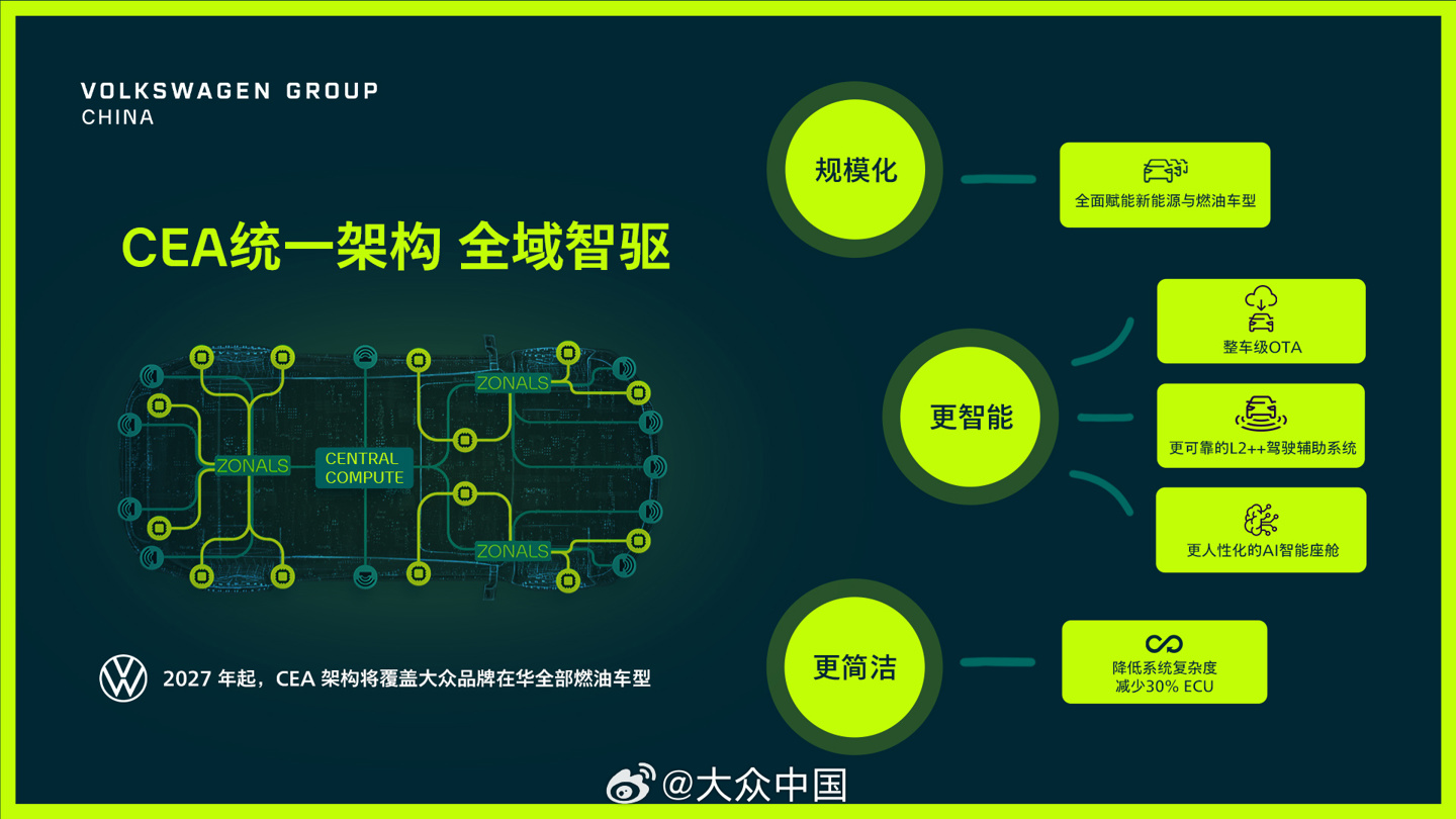 大众中国官微介绍,2027 年起,双方联合开发的 CEA 架构将拓展应用到大众品牌在华生产的燃油、混动车型。