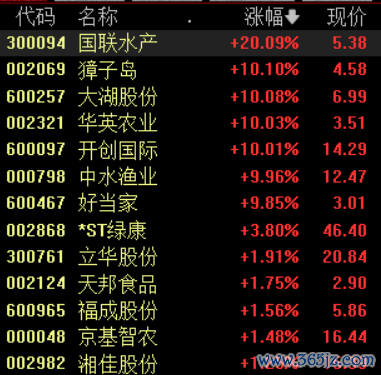 具体来看,水产股集体大涨,国联水产、獐子岛、大湖股份等多股涨停。