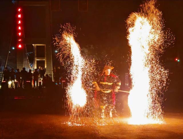 据悉,此次非遗演出共10个节目,个个藏着“真功夫”,尤其以“火元素”节目最为吸睛。其中“火棍”“火龙棍”“风火轮”则将力量与技巧融为一体,表演者手持带火道具翻转腾挪,火光在夜色中划出灵动弧线,仿佛“火舞”般绚烂;而“火立方”“火壶”“非遗火炭”三项表演更具地方特色,传承人凭借对火候的精准把控,在高温道具上展现绝活。